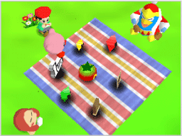 ステージをクリアするとゴールゲームに挑戦できます(ボス敵と戦うステージを除く)。食べ物や星のかけら、カードなど、いろいろなアイテムが置かれているので、ほしいアイテムに向かって、カービィをジャンプさせましょう。 |