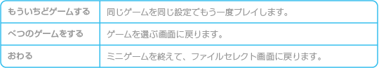 ファイルセレクト画面の「オプション」にある「ミニゲーム」では、1〜4人で3種類のミニゲームを楽しむことができます。以下の手順で始めましょう。 |