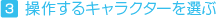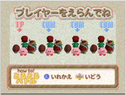 自分が操作するキャラクターを、参加者がそれぞれ選んでください。COMが操作するキャラクターは自動的に決まります。COMが参加しない場合は、参加者全員がキャラクターを選ぶと、ゲーム開始です。 |
