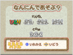 参加する人数を「ひとり」〜「よにん」から選んでください。 ミニゲームはすべて、4人で対戦するゲームです。参加人数が3人以内のときは、残りのプレイヤーをCOM(コンピュータ)が担当します。 |