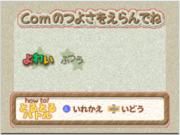 COMが参加する場合は、COMの強さを選んでください。強さを決定すると、ゲームが始まります。 なお、最初は「よわい」しか選べませんが、プレイするミニゲームで1位になったことがあると、ほかの強さも選べるようになります。 |