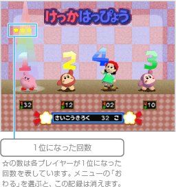 ゲームが終わると「けっかはっぴょう」画面になり、最高記録を出していると自動的に保存されます。 なお、ゲーム中に |