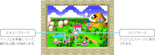 作物を荒らす巨鳥「ダイナブレイド」を止めるため、カービィは旅立ちます。このゲームモードでは全体マップがあるので、 ![]() |