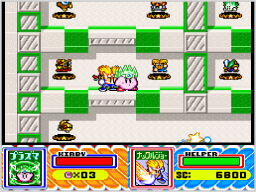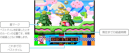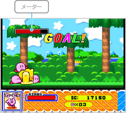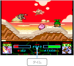 仮面の騎士「メタナイト」の野望を阻止するため、巨大戦艦「ハルバード」に潜入します。このゲームモードではタイム(制限時間)があり、0になるとミスになってしまうので注意してください。 |