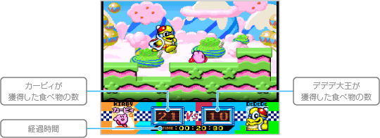 デデデ大王と競争し、たくさんの食べ物を獲得しながらゴールをめざします。3種類のコースで獲得した食べ物の合計と、先にゴールした数で得点を競い、デデデ大王より得点が多かった場合は勝利になります。