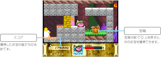 デデデ大王に奪われた食べ物を取り返すため、全4ステージを進んでください。基本的なルールで遊べる、初心者向けのゲームモードです。