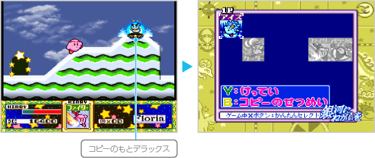 手に入れた能力は、ポーズ画面から自由に選んで、何度でも使えるようになります。 ※コピー能力の変更は、能力選択モードでも可能です。プレイ中に ![]() |