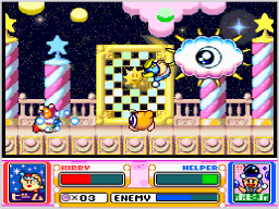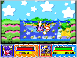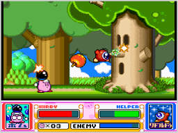 | カービィがコピー能力を持っていると、いつでもヘルパーを呼び出せます。ヘルパーがいると、自動で敵を攻撃してくれるので頼りになります。 ヘルパーの体力がなくなりそうになったら、すっぴんビームでヘルパーを能力アイテムに変化させて飲み込み、もう一度ヘルパーを呼び出すと、体力が完全に回復するので便利です。 |