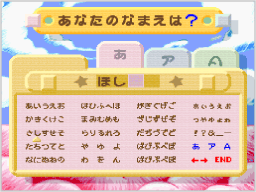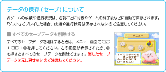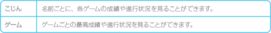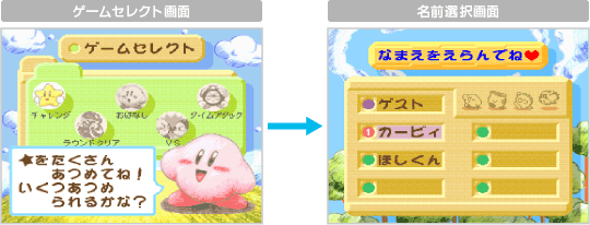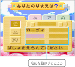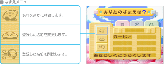 タイトル画面で ※各ゲームの成績や進行状況を保存するには、「なまえ」で名前を登録しておく必要があります。 |