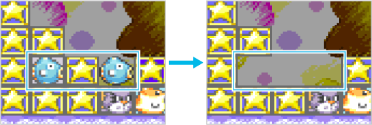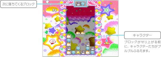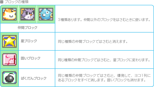 落ちてくるブロックを操作して、同じ種類の仲間ブロックで星ブロックや固いブロック、ばくだんブロックをはさんでください。星ブロックが消えたり、固いブロックが星ブロックに変わったりします。ただし、間にほかの種類の仲間ブロックをはさんでいると、何も消せないので注意してください。