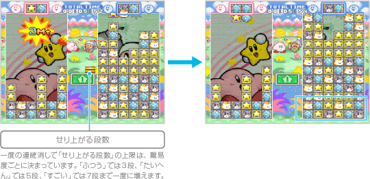 「おはなし」と「VS」で3連続以上の連続消しを行うと、相手のブロックの列をせり上げます。せり上がる段数は「連続消しが続いた回数から1を引いた数」になります。 ![]() |