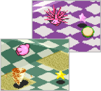 対戦モードでは2人で交互にカービィを転がします。黄色とピンク色、2色のカービィが大激突!?星を奪い合ったり、能力を奪い合ったりして熱い勝負を繰り広げてください。 上手に星を取れても油断大敵! 一発逆転もあるかもしれません。 |