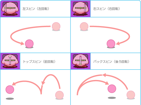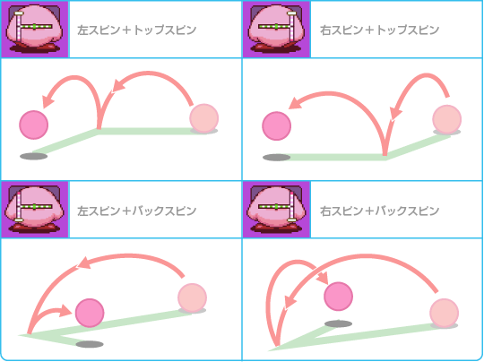 バーが真ん中から左に行くほど強い左スピンが、右に行くほど強い右スピンが加わります。マーカーは真ん中より上に行くほど強いトップスピンが、下に行くほど強いバックスピンが加わります。