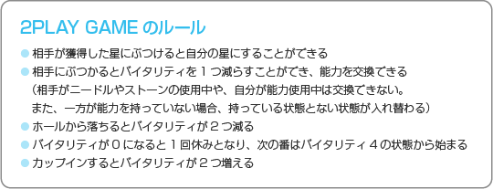 1打ずつ交互に打っていき、獲得した星の数を競います。敵を星に変えていき、どちらかがカップインすると、その時点での星の数が得点として入り、次のホールに進みます。全8ホールで獲得した得点の合計が多いプレイヤーが勝ちです。