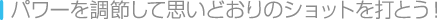 | 同じ方向にガイドラインを設定しても、パワーの強弱やスピンのかけかたによって実際にボールを打ったときの球筋が変化します。近場を狙うときは弱く、遠くに飛ばすときは強く打つなど、状況に応じて変化をつけてください。 | ![]() |