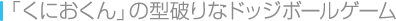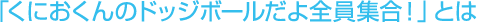 | 「くにおくんのドッジボールだよ全員集合!」は、1993年8月6日に発売されたスポーツゲームです。味方を相手のコートに飛び込ませたり、4人で肩車をして高い所からシュートを打つなど、ダイナミックで自由度の高い戦いができます。 | ![]() |