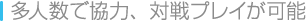 最大4人で同時にプレイすることができます。1対1で真剣勝負をしたり、4人で協力して試合を進めたり、さまざまな遊びかたで試合をすることができます。 ![]() |