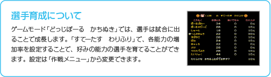 自分のチームを作成し、世界各国のチームと勝負をして世界一のチームを目指すゲームモードです。試合をすることでお金をためてアイテムを購入でき、選手を育成することもできます。「どっじぼーる かちぬき」は以下の流れで進みます。 |