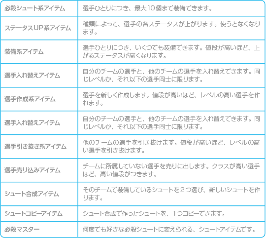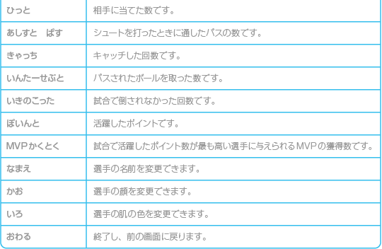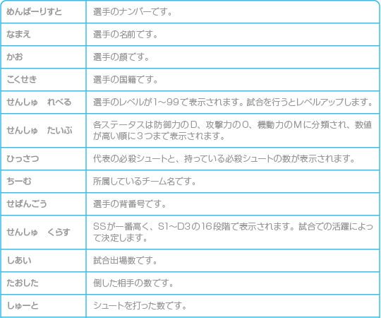 各選手が持っている、必殺シュートを打つ条件を設定できます。 |