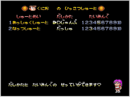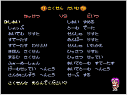 試合の前に作戦メニューが表示されます。ここではアイテムの購入や使用、選手育成などが行えます。ゲームモード「どっじぼーる かちぬき」「どっじぼーる たいせん」「めちゃぶつけ たいせん」ごとに選べるメニューが異なります。 |