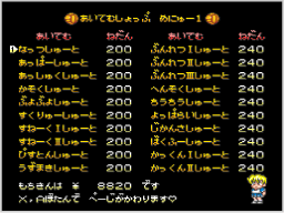 売っているアイテムと持ち金が表示されます。アイテムは以下のような種類に分けられます。購入したアイテムは、「あいてむ りすと」画面で |