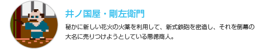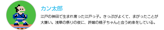 | 花のお江戸の花火職人、カン太郎は京の都で修行して新しい花火の製造法を身につけました。そして、この花火を江戸のみんなに見せようと、東海道の旅を始めるのでありました。 ところが鉄砲を密造する「井ノ国屋・剛左衛門」という悪い商人がいて、新しい花火の製造法を鉄砲作りに利用しようと考えました。そこでカン太郎をやっつけてこの製造法の巻物を横取りしようとするのです。 カン太郎を待ち受ける敵は、ごろつき、とりつかい、盗賊、とめ女、幽霊、ぼうず、剛左衛門、忍者、編笠浪人に仕事人。 はたしてカン太郎は無事に江戸について、隅田川で花火を打ちあげられるでしょうか? |