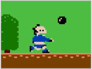 で正面に向かってかんしゃく玉を投げ、敵に当てて倒したり、ダメージを与えることができます。また、しゃがんだ状態で