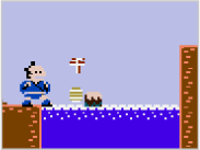 右の画面のようにジャンプでは届かない場所でも、小判を2枚以上持っていると渡り石(足場)が現れ、進めるようになります。 旅の途中で行き詰ってしまわないように、なるべく小判を集めておきましょう。 |
