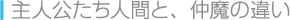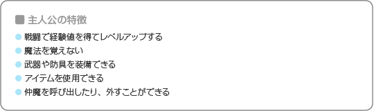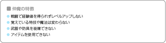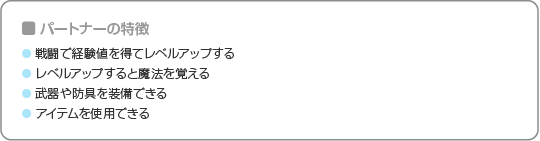 主人公は、パートナーや仲魔と共に行動します。それぞれ戦闘でとれる行動に特徴があります。