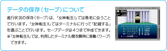 ※仲魔の数は「女神転生I」で最大7体、「女神転生II」ではあるイベントのあと、最大10体までです。