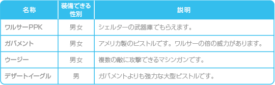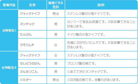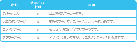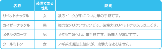 武器と防具の一部を紹介します。性別で装備できるものが異なります。 |