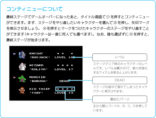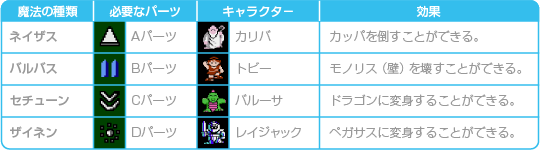 ステージ1〜4の各ステージには、4種類の「パーツ」が1つずつ隠されています。すべてのステージでパーツを手に入れ、4つ集めると、最終ステージの特定の場所で、それぞれのキャラクターが「勇者の魔法」を使うことができます。魔法を使うキャラクターを先頭にして |