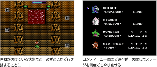 このゲームでは、途中で倒れてしまったキャラクターがいても、最終ステージに挑戦することができます。ただし、最後の敵であるドラゴンには4人の力を合わせないと勝つことはできません。倒れたキャラクターがいる場合は、コンティニューを使ってもう一度そのステージに挑戦し、全員が生き残っている状態にしてから挑みましょう。 ![]() |