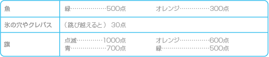 氷の穴やクレバスを跳び越えたり、氷の穴から飛び出る魚を取ったり、ステージ上にある旗を取るとスコアが増えます。また、目的地に着くと、残りタイム1秒につき100点が加算されます。 |