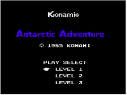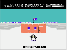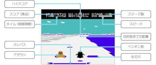 ペンギン君を操作して、南極一周をめざします。氷の穴やクレバス、アザラシなどをよけながら進んでください。南極はいくつかのステージに分かれており、制限時間内に目的地(基地)に到着すると、次のステージに進めます。なお、制限時間内に目的地に到着できない場合はゲームオーバーとなり、タイトル画面に戻ります。 |