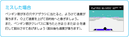 を押すと、ペンギン君がジャンプします。氷の穴やクレバスはジャンプで跳び越えましょう。ただし、氷の穴から出てくるアザラシだけはジャンプで跳び越えることができないので、注意してください。
