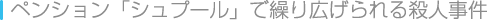 | 物語の舞台となるのは山間の地に建つログキャビン風のペンション「シュプール」。 主人公の青年・透(あなた)は、恋人の真理と2人でスキーを楽しむために、このペンションを訪れます。しかし、夕方から吹雪に見舞われたペンションは、町から遠く離れていることもあり、孤立状態になってしまいます。 そこで、第1の事件が起きました。 ペンション内の人間は、従業員を含めて13人。そのうちの1人が、客室でむごたらしく殺されていたのです。残りの12人は恐怖におののき、ペンションの談話室に集まります。犯人はどこにいるのか、ペンションのどこかに潜んでいるのか。それとも、まさかこの12人のなかの誰かが……? 見えない犯人の影におびえる12人の男女をあざ笑うかのように、次々と殺人が起きていくのです。 |