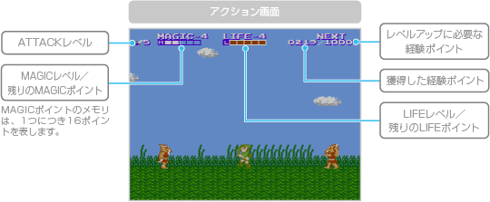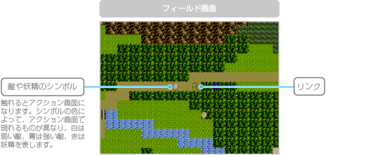 で使うことができます。町・神殿・洞窟に入ったり、敵や妖精と出会うとアクション画面に切り替わります。