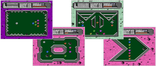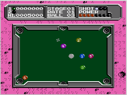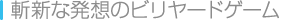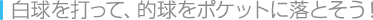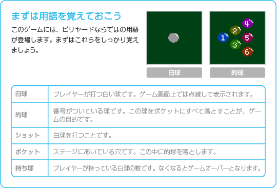 | プレイヤーはステージにある「白球」を打って、そのほかの「的球」をポケットに落としていきます。単純明快なルールですが、くれぐれも自分の白球をポケットに落とさないように注意! 打つ強さや方向、壁やほかの球にぶつかったあとの球の軌道などもじっくり考える必要があります。 | ![]() |