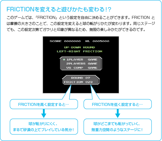 『LunarBall』は1985年12月5日に発売されました。とてもシンプルなビリヤードゲームですが、たくさんのステージを選べたり、球の転がりかたを自由に設定して、奥深い遊びかたが楽しめる作品です。 |