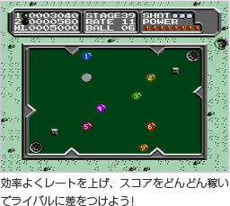 | 「レート」とはスコアの倍率を表し、的球を1つポケットに落とすと、「的球に書かれた番号×レート×10点」が加算されます。レートは的球を落とすと上がっていき、失敗する(的球を落とせない、白球をポケットに落とす)と1にもどります。また、1回のショットで2つ以上の的球を落とすと、レートがさらに加算されます。「2PLAYERS GAME」や「VS COMP GAME」ではこのルールをうまく利用して、スコアを稼ぎましょう。 | ![]() |