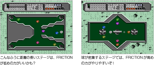 ステージには複雑な形のものや、的球の配置が非常にイジワルなものなど、難易度の高いものがたくさんあります。なかなかクリアできそうにないこんなステージには、FRICTIONを変えて挑戦してみましょう。ステージによっては、FRICTIONを変えるだけで難易度が大幅に変わります。いろいろ試してみてください。 ![]() |