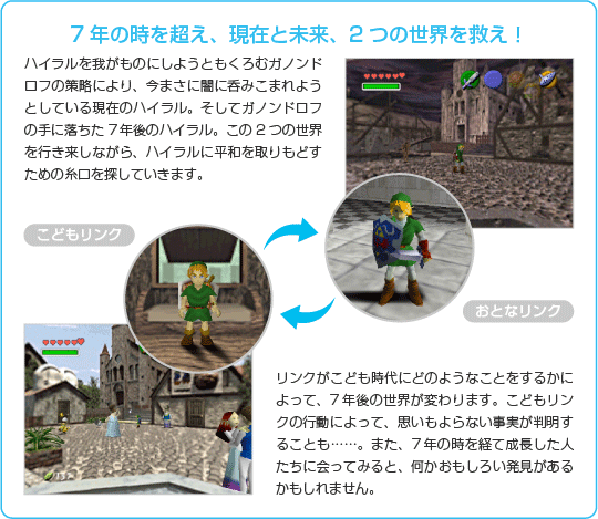 | シリーズごとに時代や主人公の設定が変わる『ゼルダの伝説』。今回の主人公は、コキリの森に住むコキリ族の少年リンクです。リンクは、コキリ族ならば必ず1人1匹持っていると言われる妖精を持たず、仲間たちからはいつも半人前扱いされています。彼が持っているものは、まっすぐな心と勇気だけ。プレイヤーはまだまだ未熟なリンクとなり、知恵と勇気でさまざまな謎を解いていってください。数々の苦難を乗り越えて成長していくリンクは、長い旅を終えるころには本物の勇者になっているでしょう。 | ![]() |