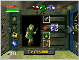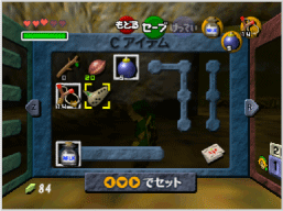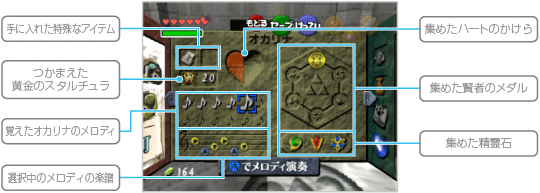 ゲームを進めるうえで重要なアイテムや、主人公が覚えたオカリナのメロディなどが表示されます。
