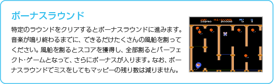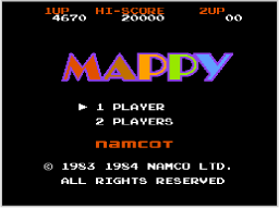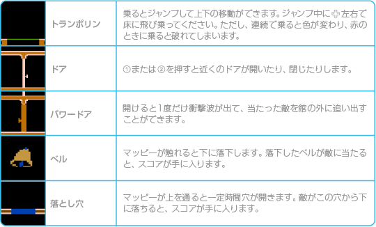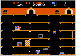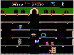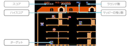 ニャームコたち(敵)につかまったり、床下や落とし穴に落ちるとミスになり、マッピーの残り数が1つ減ります。マッピーの残り数が0のときにミスするとゲームオーバーです。 ※特定のスコアを獲得するとマッピーの残り数が1つ増えます。 ![]() |