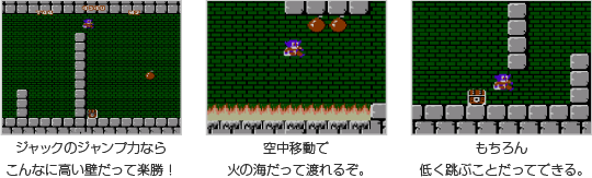 マントを身につけたジャックの得意技はジャンプです。ピラミッドの中では、いくつもの高い壁や広い火の海などを越えていかなければ先へ進めませんが、ジャンプ力自慢のジャックならカンタンに跳び越えられます。操作に慣れてしまえば、ジャックを空中で自由自在に動かす気持ちよさが味わえること間違いなし! ![]() |