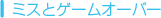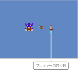 敵などに触れたりタイマーが0になるとミスになり、プレイヤーの残り数が1つ減ります。プレイヤーの残り数が1のときにミスをするとゲームオーバーです。 |