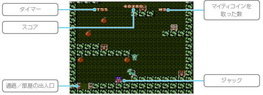 ジャックを操作してピラミッドの中を冒険します。 このゲームには全部で16のラウンドがあり、各ラウンドは「通路」と「王家の部屋」で構成されています。縦横につながる通路や部屋を、爆弾や宝箱を取りながら先へ進みましょう。通路を先へ進むと王家の部屋があり、王家の部屋ですべての爆弾を取って出口から出るとラウンドクリアです。すべてのラウンドをクリアすると、ラストへ向かう通路に続きます。 なお、ゲーム中に+を押すとポーズ(一時停止)できます。 ![]() |