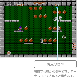 部屋の中に現れるすべての爆弾を取ると出口が開きます。このとき、火がついている爆弾から順番に取ると高得点が入ります。なお、王家の部屋ではマイティパワーを使うことができず、 |