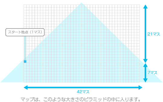 マップを作りながらプレイすると、楽しさが数倍広がります。1画面を方眼紙の1マスとして、縦、横につながりがわかるように書き込んでいくと、ピラミッド型の中に入る迷路が浮かび上がるはずです。このマップをよく見て、隠し通路や隠れた謎を推理してみましょう。